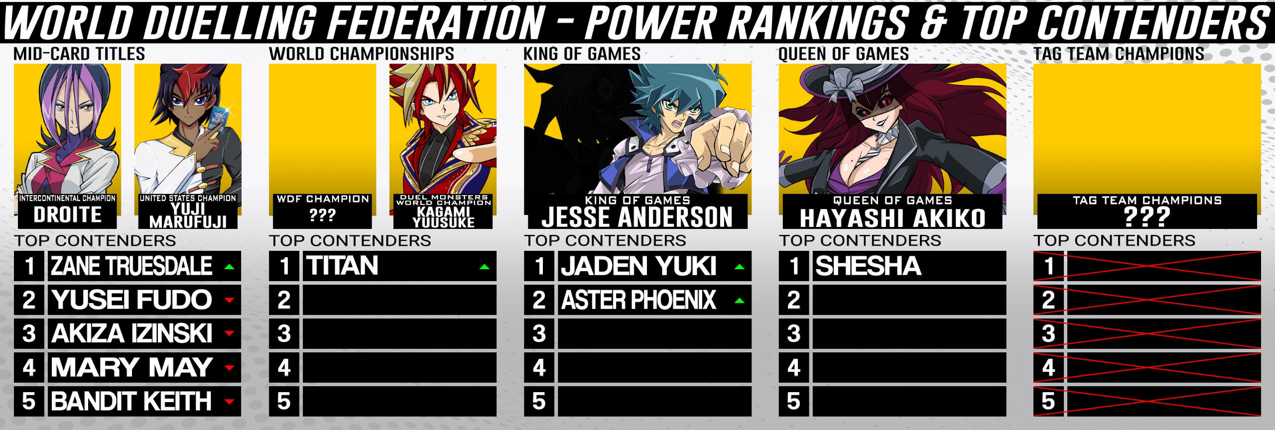 King of Games | (Men's) Undisputed Championship | Jesse Anderson | The King of Games or the King of Duelists is the top title within the WDF. It is a title awarded originally to winners of tournaments such as the original Duelist Kingdom or the original Battle City. This title is considered 'universal' and holds precedence over all other titles, but stands alongside its Queen counterpart. This title was originally held by Yugi Muto. |